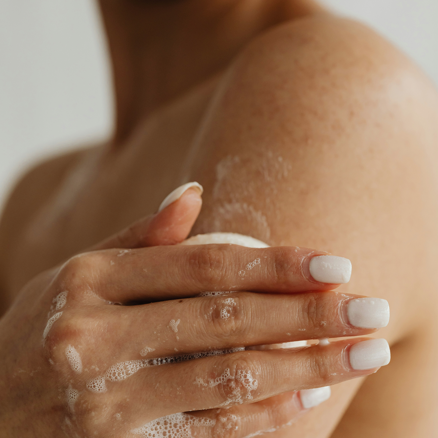 Apply Scrub – Squeeze a small amount of foaming scrub onto your hands or a loofah.